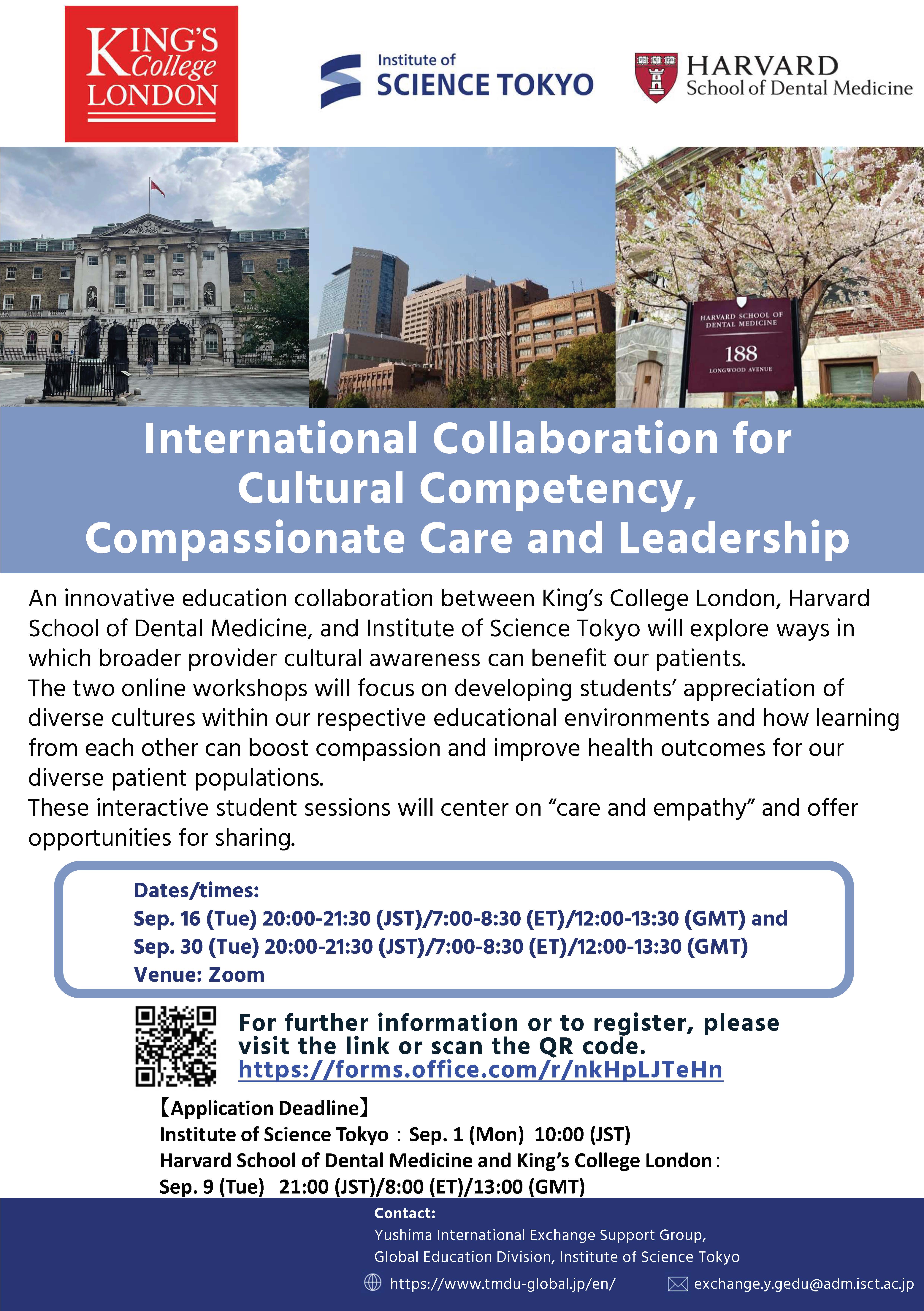An “International Collaboration for Cultural Competency, Compassionate Care and Leadership” workshop took place on Tuesday, 16th and 30th September 2025. Students at Institute of Science Tokyo (Science Tokyo), King’s College London (King’s), and Harvard School of Dental Medicine (HSDM) joined this session. In the first session, a faculty member from King’s joined online and kindly gave a lecture about cultural competency, care, and empathy. Students were then given tasks related to care and empathy in a non-dental/medical environment and asked to work within their groups to prepare presentations. In the second session, students from the three universities gathered again to share their presentations, which included video and still photos of places of interest in Boston/London/Tokyo. This helped deepen their understanding of cultural competency, compassionate care and leadership.