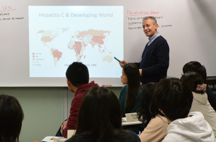 For Session 9 of the Fundamentals in Global Health course, we invited Dr. Stewart Geary, M.D., Senior Vice President and Chief Medical Officer of Eisai Co., Ltd. for an interactive lecture on access to medicine. Students had lively discussions on the difficulties involved in drug development and distribution of new drugs around the world. It was very fulfilling to see them use all of their past learning plus the new information from this evening to think deeply and express their opinions concerning this topic.